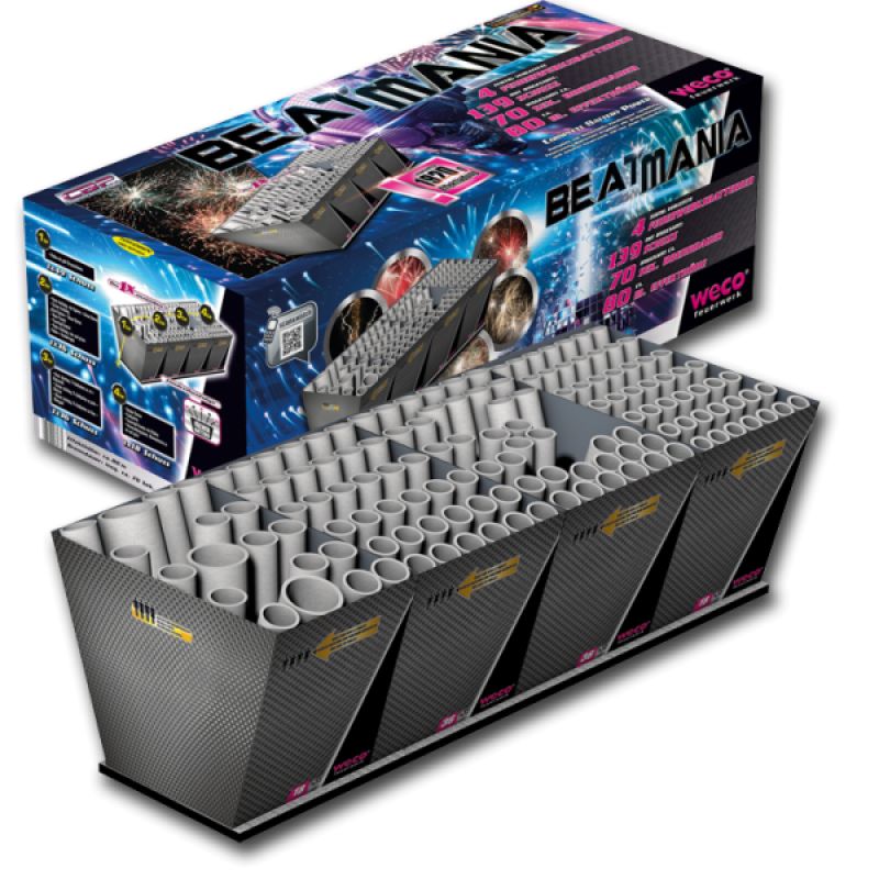Ein 4er Baterrieverbund der Spitzenklasse Fächerförmige Heuler, die in Crackling-Waves übergehen. Das Ganze steigert sich durch V-förmig Bukets, Blinkern, Crackling-Fächereffekte und Goldweiden. Besonders imposante Feuertopf-Abschüsse und variierende Gold-Effekte runden im Finale dieses Verbundfeuerwerk ab.