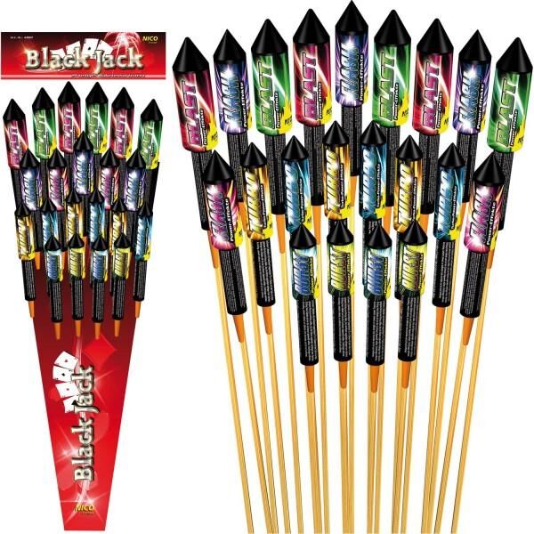 Großes Raketensortiment mit 21 Kopfraketen und verschiedenen farbenfrohen Effektbuketts.