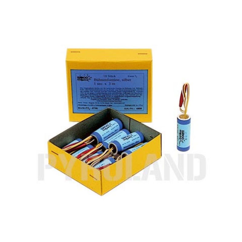 Raucharme Silberfontäne mit einer Brenndauer von ca. 1,2 Sek. und einer Effekthöhe von ca. 5m. 1 Packung á 10 Stück Elektrisch zündbar! Mit einer geeigneten Zündanlage nutzen. Technische Voraussetzungen: Mindestens 12V oder 0,85