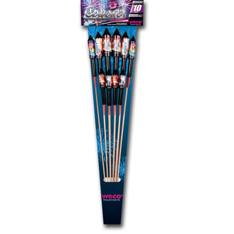 10-teiliges Raketen-Sortiment 10-teilig, 5-fach sortiert. Mit prächtigen Mutlicolour-Effekten, smaragdgrünen und brillantroten Leuchtbuketts tollen Silberflimmer-Wolken