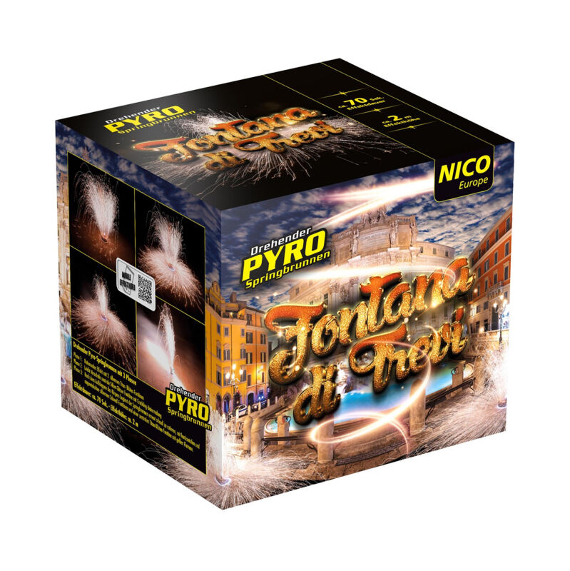 La dolce vita trifft auf pure Feuerwerkskunst! Mit der FONTANA DI TREVI entdecke einen Hauch italienischer Eleganz – ein wahres Kunstwerk aus Feuer und Bewegung! Der wunderschöne, sich drehende Springbrunnen mit 8 Brändern. Phase 1: Die Show beginnt mit rotierenden Effekten, begleitet von zwei silbernen Titan-Blüten-Fontänen. Phase 2: Im Zentrum erhebt sich eine tänzelnde Silber-Glitzer-Fontäne, untermalt von knisterndem Crackling – ein funkelndes Spiel, das an Sonnenstrahlen im Wasser erinnert. Phase 3: Dann öffnet sich die Batterie wie ein Kunstwerk, und der Brunnen beginnt erneut zu rotieren: silberne Schweif-Fontänen sprühen in alle Richtungen, während die zentrale Titan-Blüten-Fontäne mit gelber Flamme das Finale einläutet, das so überraschend und lebendig ist wie das Treiben auf der Piazza Trevi! Für Liebhaber von Eleganz und Innovation: Die Fontana di Trevi ist die perfekte Wahl, um einen Abend unvergesslich zu machen.