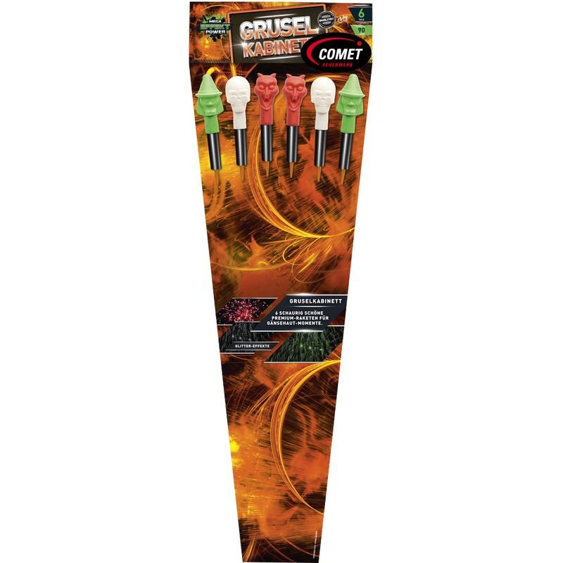 Comet Gruselkabinett Raketensortiment 6-teilig – schaurig-schöne Raketen für atemberaubende Gänsehaut-Momente Du möchtest Dich wieder einmal so richtig gruseln und das auch über gruselige Anlässe hinaus? Die Silvesterparty bietet hierzu eine wunderbare Gelegenheit. Wenn Du Party und Feiern im etwas anderen Stil schätzt und Dich mit Deinen Silvesterraketen vom klassischen Feuerwerk abheben möchtest, empfehlen wir Dir, dem Comet Gruselkabinett Raketensortiment – 6-teilig mit Kunststoff-Köpfen – Deine Aufmerksamkeit zu schenken. Schaurig-schöne Raketen mit Kunststoff-Köpfen präsentieren sich als Feuerwerk mit hohem Gruselfaktor für Gänsehaut-Momente bei Groß und Klein. Solltest Du Dich noch nicht beim Anblick von Kunststoff-Köpfen gruseln, entfesselt die laute Lautstärke möglicherweise das Potenzial in Deinem persönlichen Gruselkabinett. Diese Highlights bietet das Comet Gruselkabinett Raketensortiment Das Raketensortiment ist 6-teilig und kommt mit einer 50-Meter-Effekthöhe daher. Die Silvesterraketen steigen demzufolge in schwindelerregende Höhen und hauchen Dir und Deinen Lieben einen gruseligen Schauer über den Rücken. Ein sensationelles Gefühl! Genieße diesen emotionalen Moment gemeinsam mit Deiner Familie und mit Deinen Freunden. Für Gänsehaut-Momente sorgen die Silvesterraketen auch bei etwas größeren Kindern, die das Comet Gruselkabinett emotional einzuordnen wissen. Da das Raketensortiment als Feuerwerk der Kategorie F2 konzipiert ist, ist es der ausschließlichen Verwendung durch Erwachsene vorbehalten. Übrigens zerbersten die Silvesterraketen bei Deiner Party und beim Feiern mit Deinen Lieben in den Farben Rot und Weiß – ein hervorragend brillantes, nächtliches Spektakel, das Euch noch lange in Erinnerung bleiben wird. Halloween mit dem Comet Gruselkabinett Raketensortiment Die Silvesterraketen sind mit ihrem Gruselfaktor selbstverständlich ebenso eine exzellente Wahl, um Halloween stilecht zu zelebrieren. Hole Dir für diesen Anlass eine Ausnahmegenehmigung bei der zuständigen Behörde, damit Du an Halloween mit Feuerwerk eine Party feiern kannst. Auch bei diesem Ereignis sorgen schaurig-schöne Raketen von Comet für Gänsehaut-Momente. Dank ihrer 50-Meter-Effekthöhe und durch die laute Lautstärke hebst Du Dich mit Deiner Party beim Feiern von anderen Halloween-Partys ab. Bestelle jetzt Dein Feuerwerk!