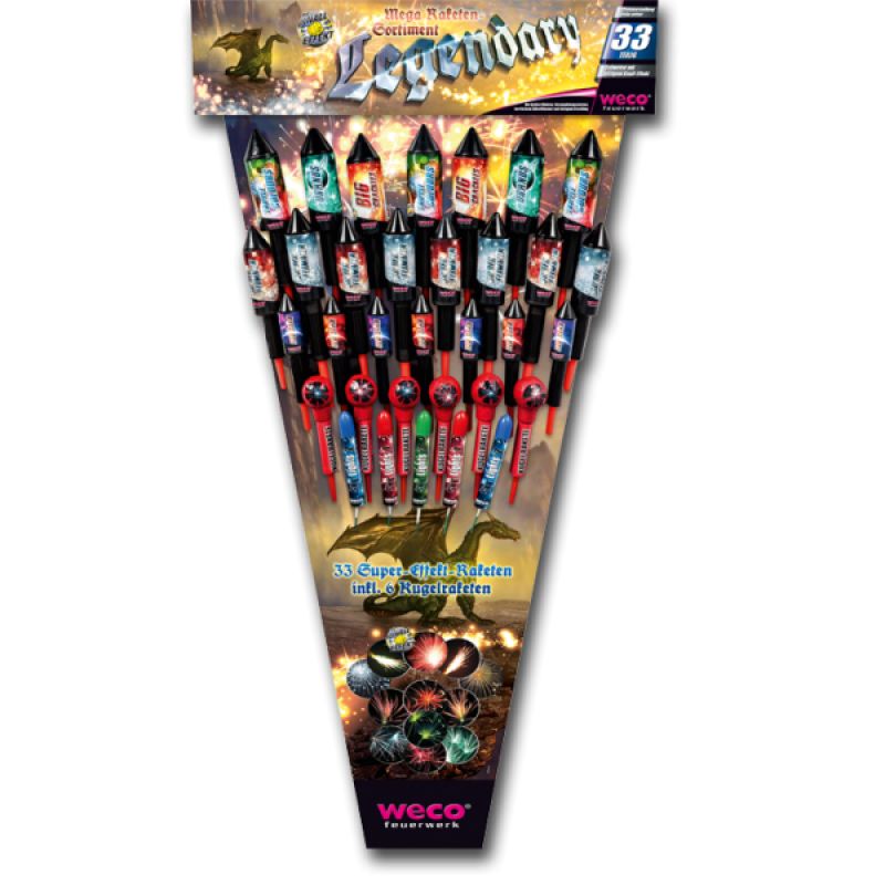 33-teiliges Raketen-Sortiment Großes Raketenset mit Crackling, Kugelraketen, Silberflimmer und Verwandlungssternen.