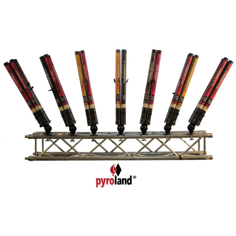 Die Pyroland Single-Shot Halterung für große Bühneneffekte bis ca. Kaliber 50mm und Pyroland BloJob Konfettishooter. Bis zu 4 Effekte können an einem Single-Shot-Halter befestigt werden. Jeder Pyro-Effekt oder Konfetti-Shooter wird mit eigenen Kabelbindern fixiert. Sollte sich ein Effekt beim Abschießen losreißen, bleiben die anderen sicher fixiert. Die runde Auflage-Platte sorgt für ein zuverlässiges Abfangen des Abschuss-Rückstoßes. Sie kann in verschiedenen Höhen arretiert werden, so dass auch Effekte mit kurzen Hülsen optimal befestigt werden können. Alle Teile der Pyroland Single-Shot Halterungen werden in Deutschland hergestellt. Die Laserstrahl-geschnittenen Bauteile ermöglichen exakt gewinkelte Effektbilder. Die mattschwarze Pulverbeschichtung sorgt für eine lange Lebensdauer. Die Bodenplatten der Halterungen können wahlweise mit Schrauben am Bühnenboden, oder mit Hilfe einer Traversen-Schelle an Rohren/Traversen befestigt werden. Die Single-Shot Halterungen für große Pyro-Effekte können in 19 verschiedenen Winkeln in 10°-Schritten arretiert werden. 1 Halterung