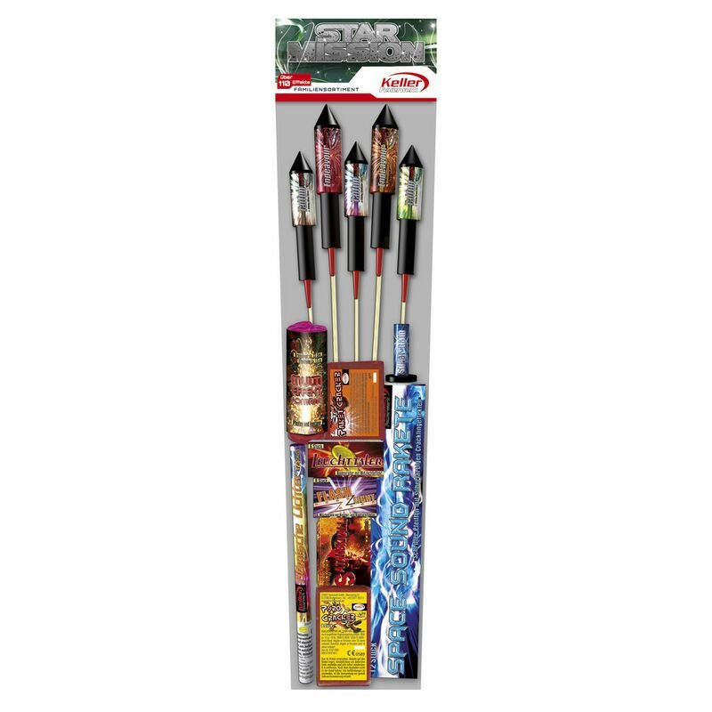 Silvester familienfreundlich böllern und Spaß haben Hier erwartet Dich ein Feuerwerk der besonderen Art. Dein Silvesterabend wird zum Erlebnis für die ganze Familie, denn das Star Mission Familien-Sortiment 110-teilig (bunt gemischt) von Keller beinhaltet nicht nur 17 Raketen, sondern auch eine Vielzahl an großartigen Leucht- und Knallartikeln. Silvester für die ganze Familie Traditionell wird am Silvesterabend das alte Jahr verabschiedet und das neue Jahr begrüßt. Mit viel Radau und Getöse wollte man früher die bösen Geister vertreiben. Heute erfreuen sich Groß und Klein an den bunten Raketen, die Du mit feurigem Zischen in den Himmel steigen lässt. Dort malen sie wunderbare Effekte und lassen die Augen der Kinder leuchten. Doch die Jüngsten wollen selbst aktiv mitmachen. Das Star Mission Familien-Sortiment beinhaltet neben 17 Raketen noch eine Vielzahl an großartigen Leucht- und Knallartikeln, die teilweise schon für Kinder geeignet sind. So dürfen sich auch Deine Kinder direkt an der schönen Tradition beteiligen. Durch die gemeinsame lautstarke Verabschiedung des alten Jahres wird der Silvesterabend zu einem unvergesslichen Erlebnis für die ganze Familie. Für jeden etwas Das Star Mission Familien-Sortiment von Keller kommt 110-teilig (bunt gemischt) daher und bringt Stimmung in Deine Silvesterparty. Dieses Feuerwerk der besonderen Art ist sehr familienfreundlich. Es enthält nicht nur Raketen der Kategorie F2, sondern viele weitere Knaller und Leuchtartikel für die ganze Familie. Vater, Mutter und die Kinder finden ihre persönlichen Favoriten, die sie knallen, zischen, leuchten oder in den Himmel steigen lassen können. Beachte dazu bitte die Altersfreigabe auf den einzelnen Artikeln. Familienfreundlich Dieses Star Mission Familien-Sortiment 110-teilig (bunt gemischt) von Keller enthält sowohl Artikel der Kategorie F2 als auch familienfreundlich-effektvolle Knaller. Damit wird dieses Feuerwerk der besonderen Art am Silvesterabend zum gemeinsamen Spaß für die ganze Familie, Deine Freunde und Gäste.