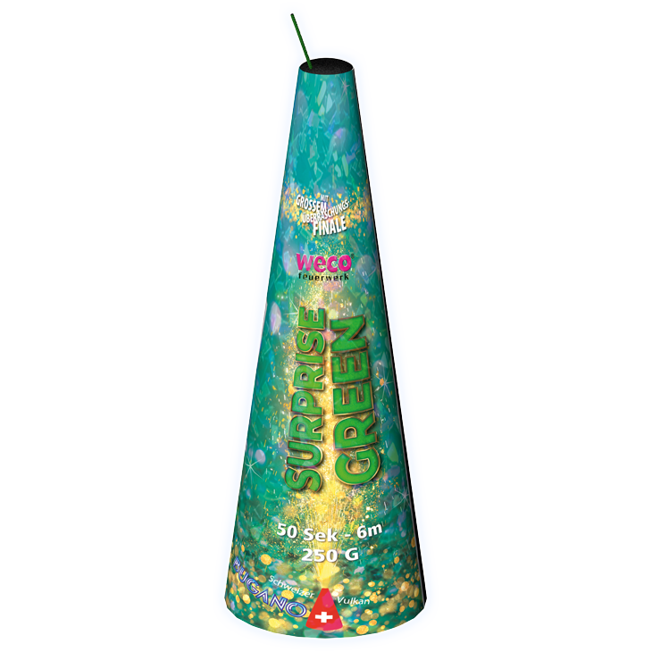 Herrliche Silberfontäne, gefolgt von einem gigantischen, bis zu 6 Meter hohen Überraschungseffekt mit smaragdgrünen Leuchtsternen. Aus schweizer Qualitäts-Fertigung.