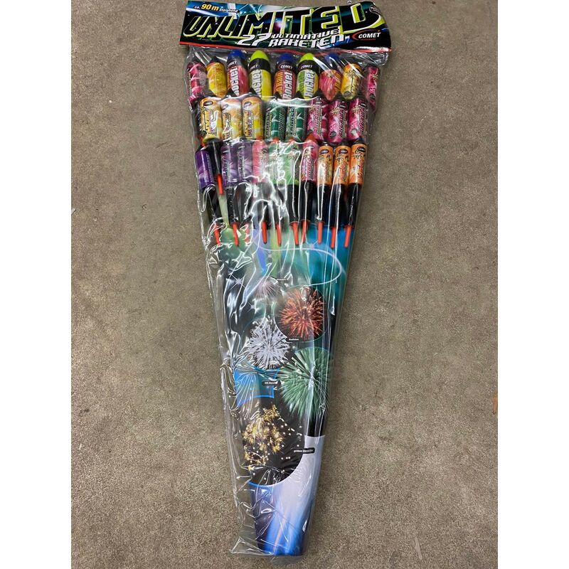 27 bombastische Effekt-Raketen: 5 XXL-Raketen mit Crackling-Effekt in Rot und Grün 4 Blinkstern-Raketen mit Silberfüllung 12 Sternwolken-Raketen mit Crackling, blauen, goldenen, roten, grünen und silbernen Sternen 6 Knallstern-Raketen mit lautstarken grünen, roten und silbernen Sternen Bild folgt!
