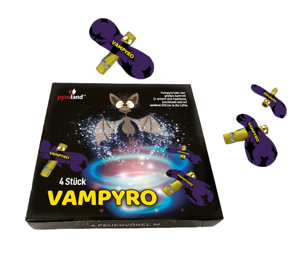 Vampyro liebt den großen Auftritt! Er erhebt sich fauchend, leuchtend und mit weißem Glitzer in die Lüfte.