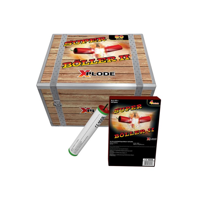 Total verknallt – klassischer Super-Böller mit extrem lautem Knalleffekt. 80 Stück Knallkörper zylindrisch mit Anzündschnur. Steigerung der Lautstärke ist Anhand der Bezeichnung A, B, C, D, I, II zu erkennen. Von „A“ = laut bis „II“ = extrem laut 1 Schinken á 10 Packungen á 8 Stück 2 Gramm NEM pro Stück
